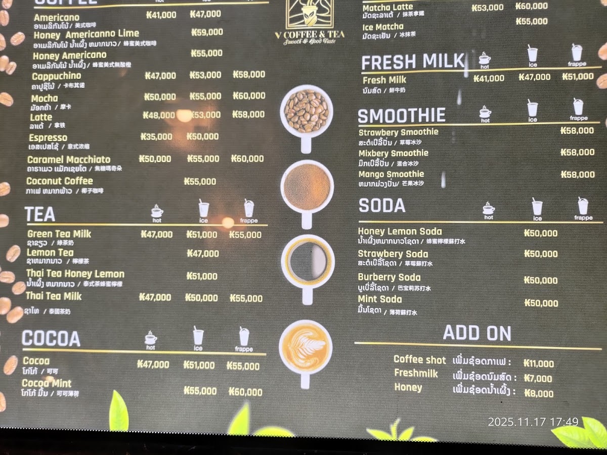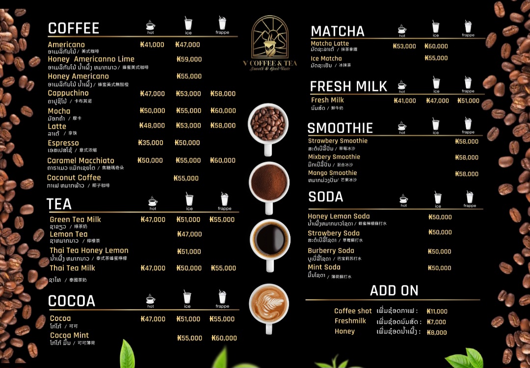 The menu at V Coffee & Tea Cafe Vangvieng offers a thoughtfully curated selection that balances classic coffeehouse favorites with local flair. The standout Cappuccino impresses with its rich crema and perfectly balanced espresso, making it a must-try for coffee enthusiasts. Alongside coffee, the café provides an array of teas and light bites, each crafted with attention to freshness and presentation. The pricing is reasonable, reflecting both the quality of the ingredients and the relaxing atmosphere of the café. Overall, the menu succeeds in offering options that cater to both casual visitors seeking a comforting drink and travelers looking to savor a carefully prepared specialty, leaving a lasting impression of quality and simplicity.